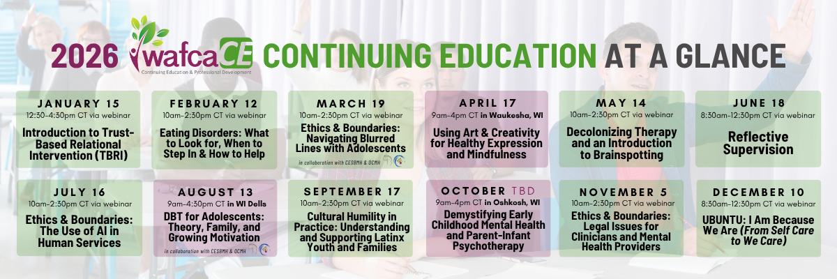 Join UsDevelop Your WorkforceWe partner with our members, consumers, and affiliates in business and academia to translate research into practice through our training sessions. Together, we foster the development of effective, responsive services for Wisconsin’s children and families through continued education and conversations. Register for TrainingsSubscribe for Free CE All YearEnjoy FREE registration on all of our highly-rated Continuing Education events with the purchase of an individual WAFCA-CE Subscription. This is ideal for those who value high-quality professional development that...